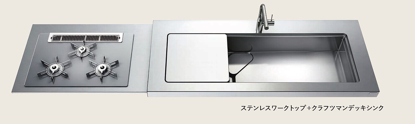 キッチンにとって、ステンレスは理想的な素材です。 プロの厨房にも使われている素材であることからも分かると思います。クリナップでは、職人技から織りなす「クラフツマンシリーズ」というデッキシンクやシンクが選択可能です。