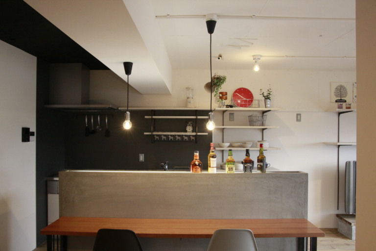 当社施工事例 Case36 カフェやBARのような雰囲気を希望されていたので、壁付けキッチンに、 モルタル塗装仕上げの壁のあるカウンターを設け、 友だちと好きなお酒を酌み交わしながら、 趣味のギターを楽しめるBARコーナーをつくりました。