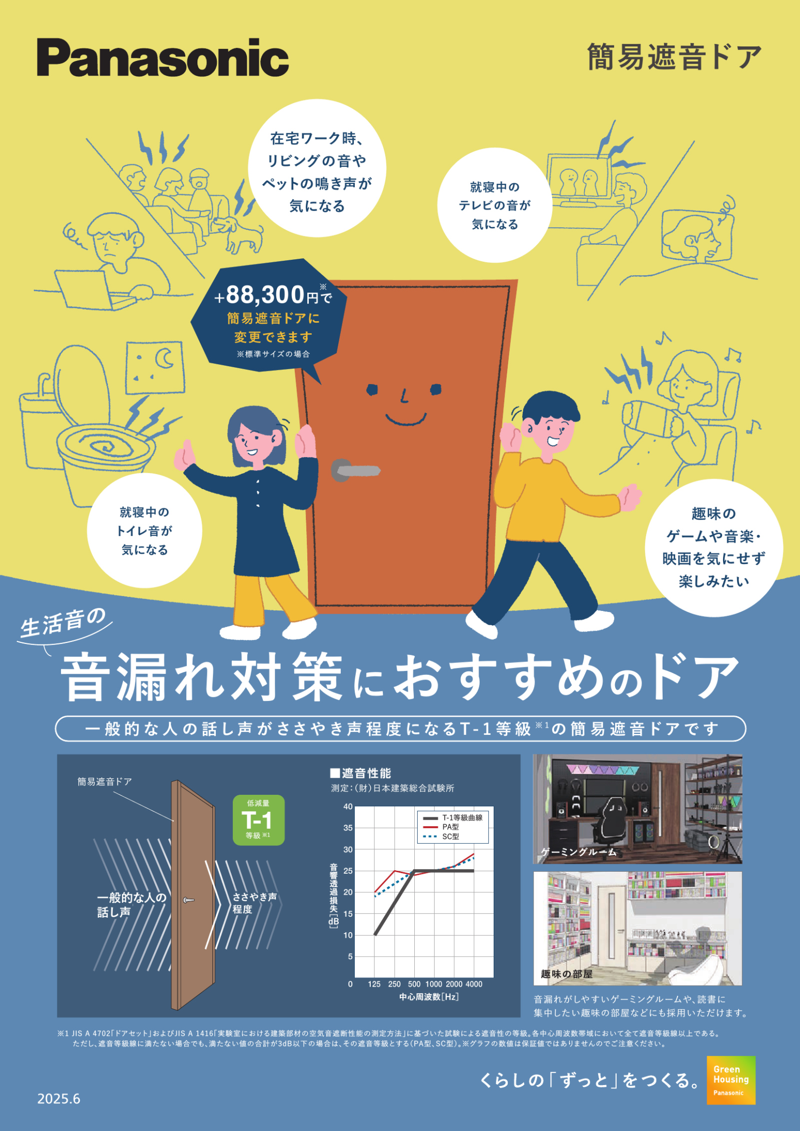そんな時に頼りになるのが、パナソニックの「簡遮音ドア」シリーズ。一般的な室内ドアと比べて遮音性能が高く、音漏れを約30〜50%カット(※周波数帯による)する仕様。