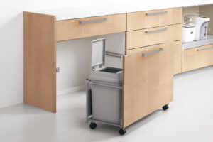 We recommend the trash bin storage included with the Panasonic Kitchen S-class cupboard.