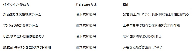 温水式と電気式、どちらの床暖房にも一長一短があります。生活スタイルや住まいの構造、使用する頻度によってどちらを導入するか検討するのがおすすめです。