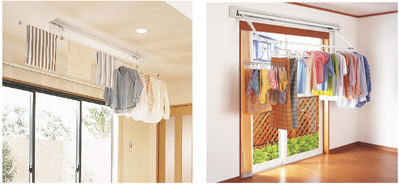 ※天井付けなどは、リモコン操作で好きなところまで物干しを降ろして、干した後は邪魔にならない位置まで天井にもっていって乾かすことができます。