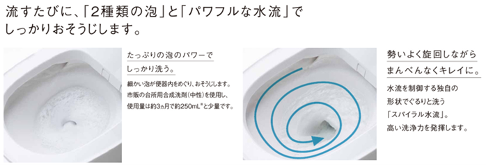 交換したトイレ、“アラウーノ”は、パナソニックの特徴である“スゴピカ素材”を使用した商品なので、汚れがつきにくく、2種類の泡とパワフルな水流で流す度にしっかりとお掃除してくれます。
