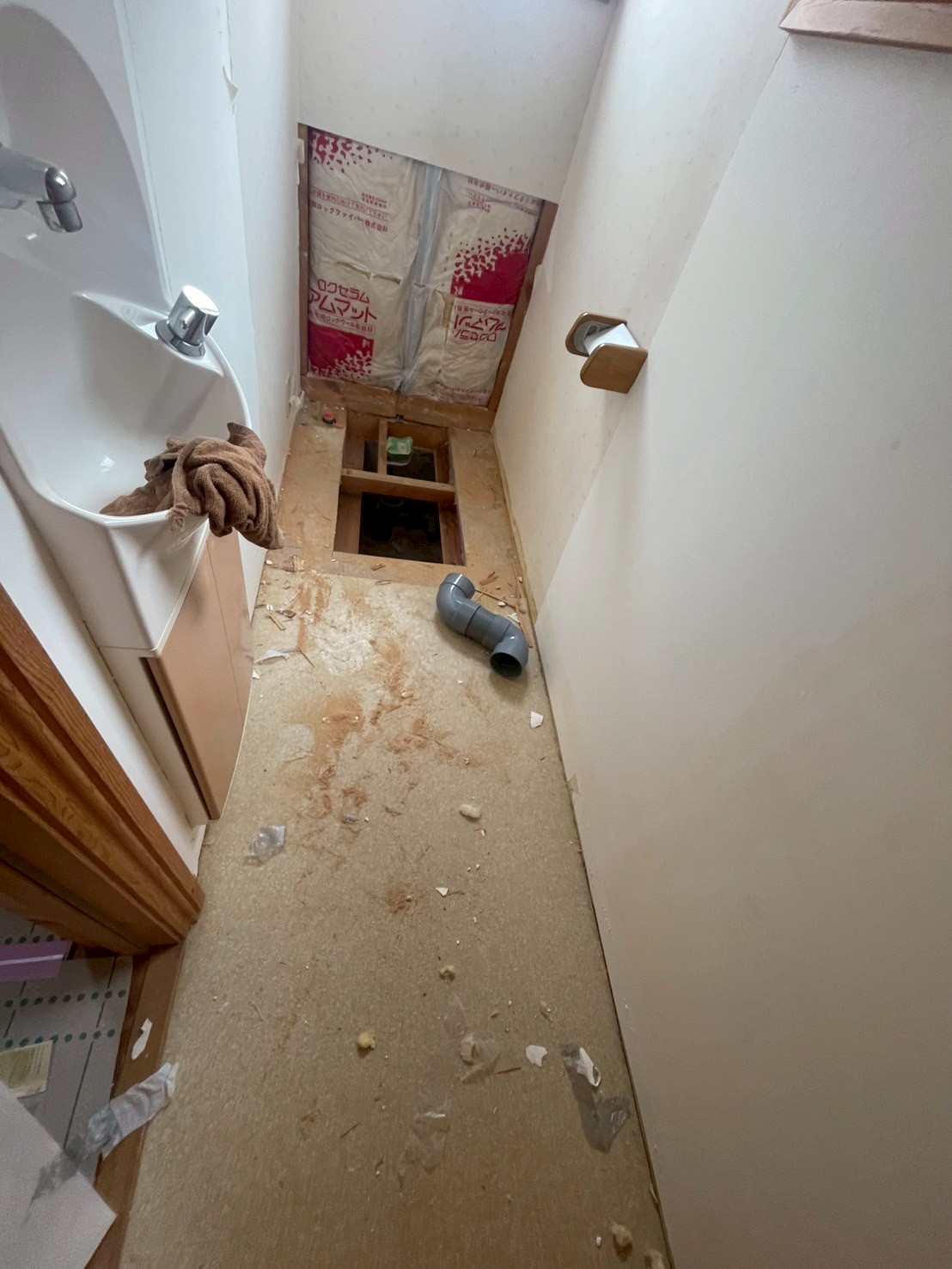 ※トイレの位置を既存の位置より前に出すため配管を移動!!(トイレが縦に長い空間なので、前に出す事で後ろを収納にする計画です)