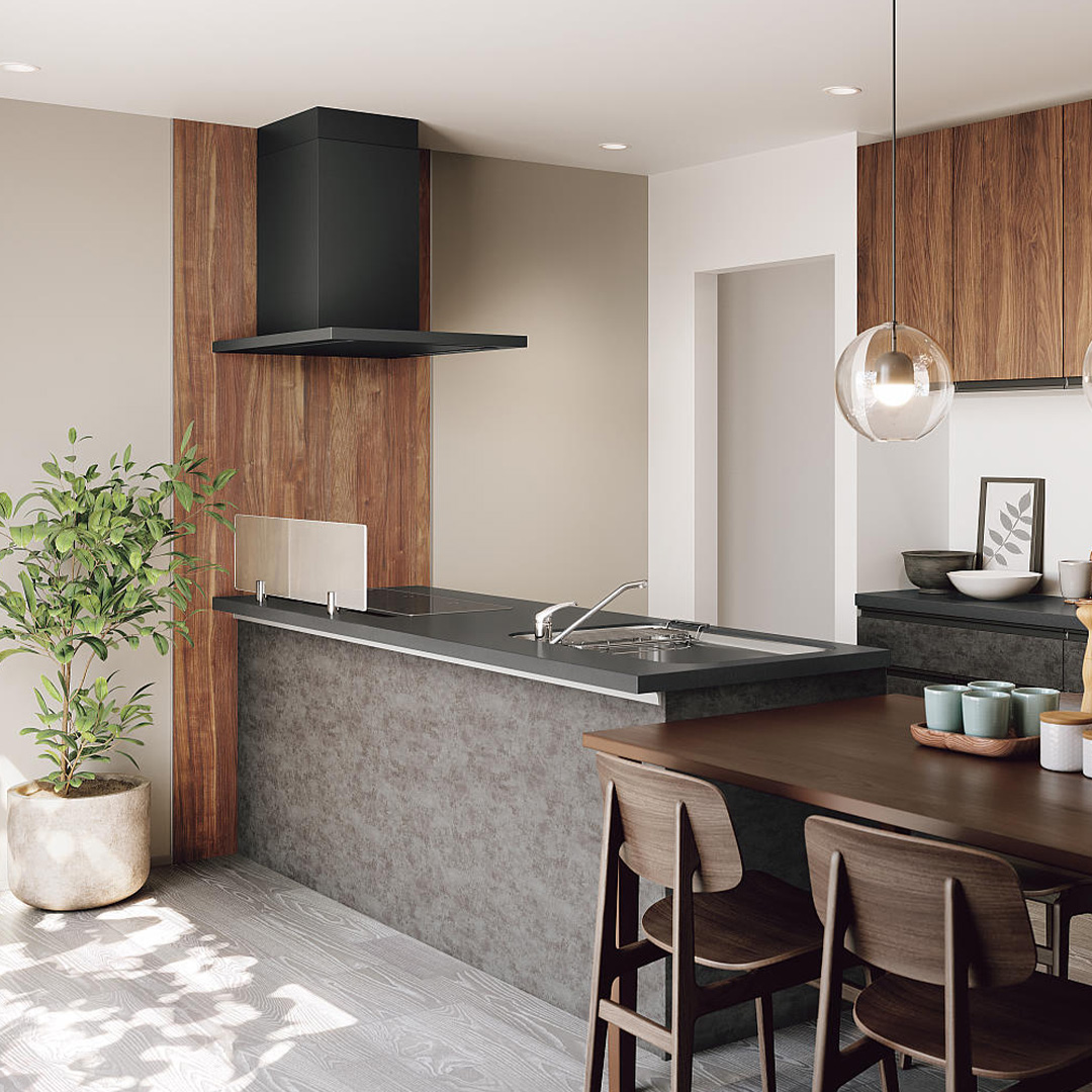 壁仕上げ材「ベリティスウォール不燃」は意匠性の高さに加え、火に強い不燃性能とお掃除のしやすさを兼ね備えた優れもの。キッチンの壁面に取り入れることで、安全性を保ちながら、空間にアクセントを加えることができます。