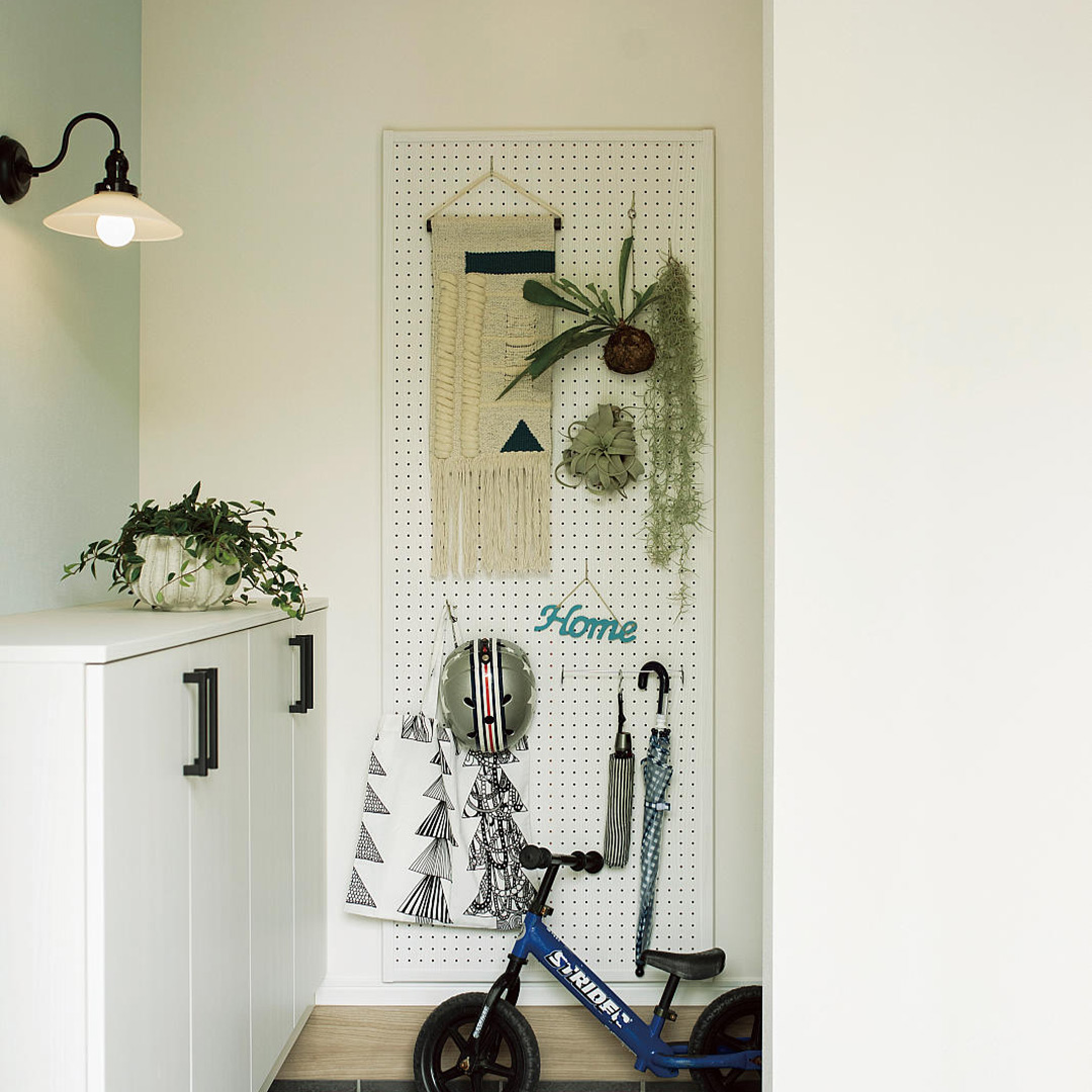 壁面を有効活用することで、手狭な玄関の収納力を高める機能的なリフォームができます。市販のフックがひっかけられる有孔化粧ボード「ベリティスウォールペグ」なら、普通の壁からお気に入りのアイテムや趣味の道具を飾って魅せる収納ができる壁に早変わり。