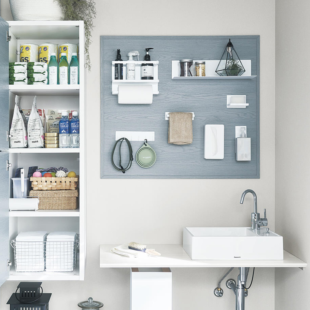 こまごました化粧品や、ペットのお手入れグッズなど、手の届くところに置いておきたいものが多い洗面スペースは何かと収納に困りがち…何がどこにあるのかわかりにくくなってしまうのも改善したいポイントです。