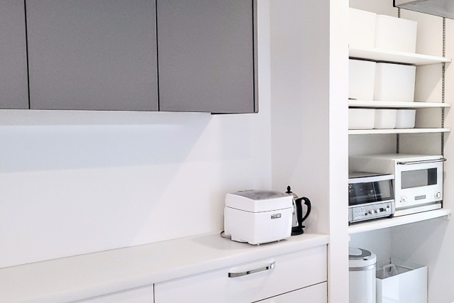 調理家電は、見せる収納棚で収納することで奥行きがなくても狭さを感じることなく収納できます。