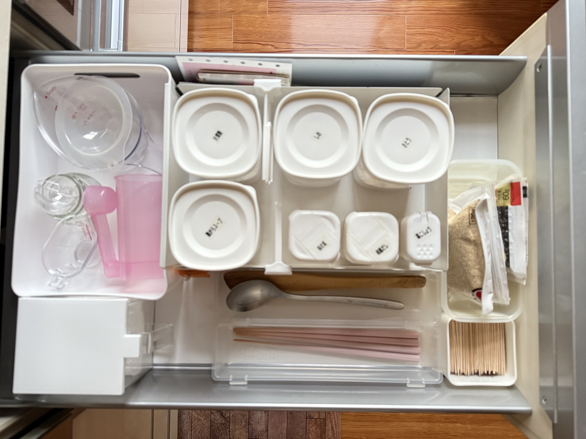 出汁パック等、ケースに詰替えるのは面倒ですが、是非詰替え可能なものは、是非詰替えて利用してください。それだけで、効率も上がり、無駄なスペースが無くなります。