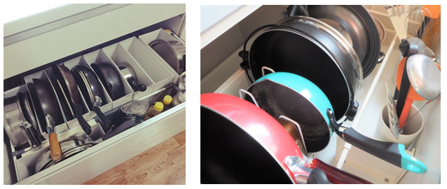 重ねて収納すると出し入れが不便で、どんな調理器具(鍋・フライパン等)があったか分からなくなってしまいます。 観音開きタイプのキッチンから引出しタイプのキッチンに代わって、どう収納していいのか分からなくなる方も多くいます。 写真で紹介をするので是非参考にしてみてください。