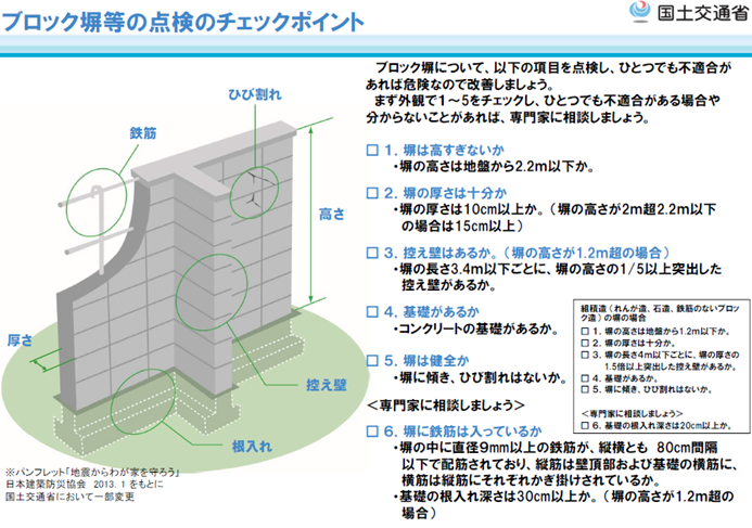 ※そこで、国土交通省より、建築基準法に基づいた「ブロック塀等の点検のチェックポイント」が示されていますので、ご紹介します。