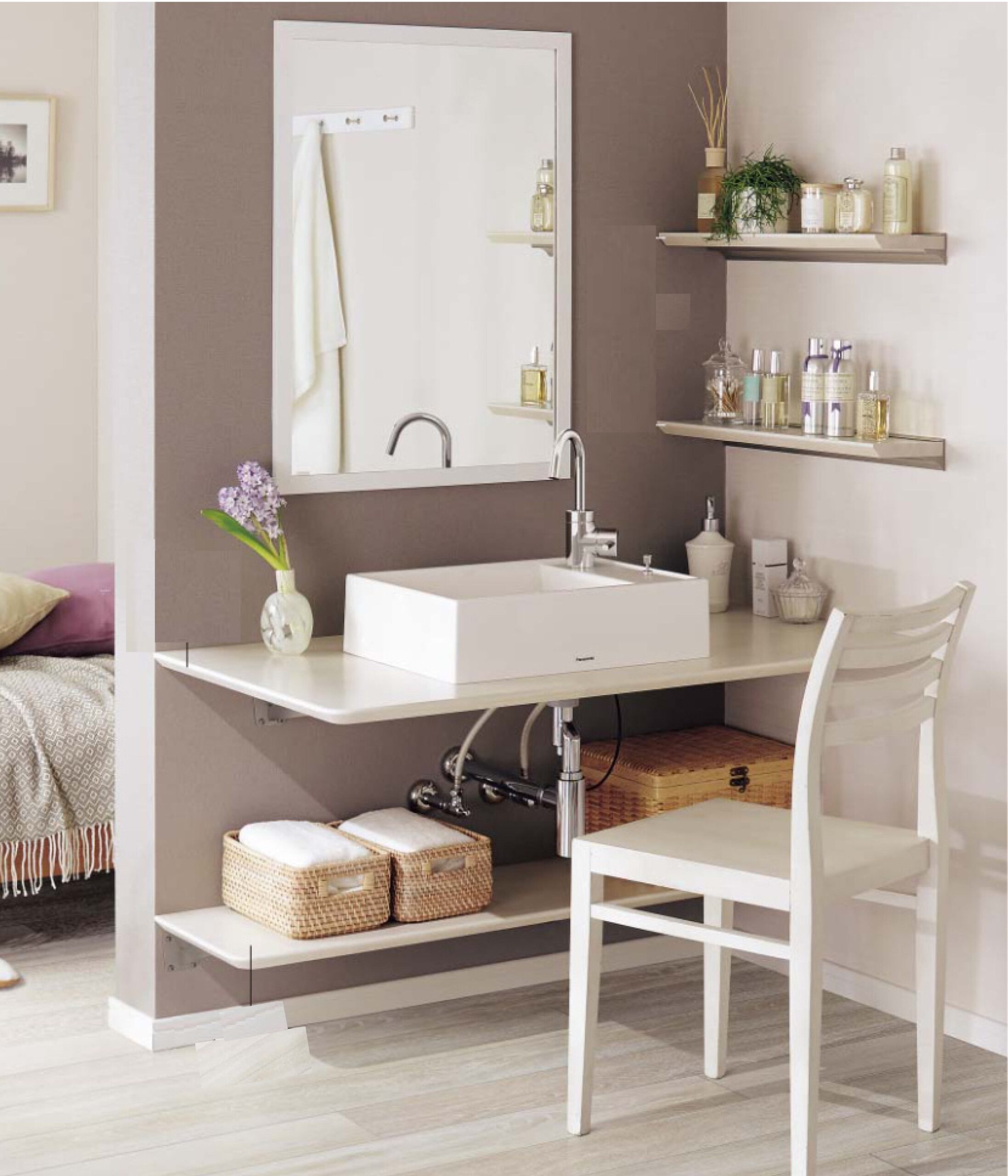 別室就寝の寝室だからこそ取り入れたいのが、化粧コーナーです。洗面所とは別に、寝室の一角に小さな化粧スペースを設けることで、朝の支度や夜のお手入れがぐっと快適になります。