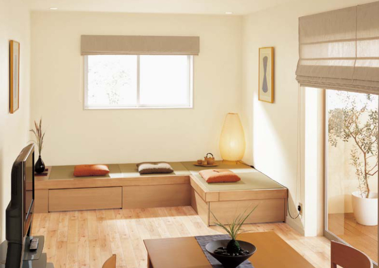 リビングの一角にソファーの代わりに和空間を作り出す畳が丘は、広さや形を自由に選ぶことができる畳コーナー収納です。ソファーやベンチのように座ったり、和室のように寝転んだりと、くつろぎ空間が生まれます。座面の下は引き出し収納とハッチ収納を組み合わせることができ、リビングで家族が使用するアイテムをたっぷり収納できます。