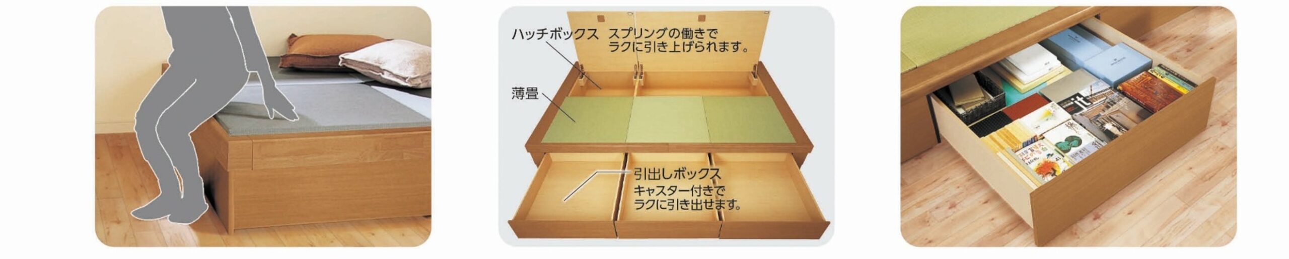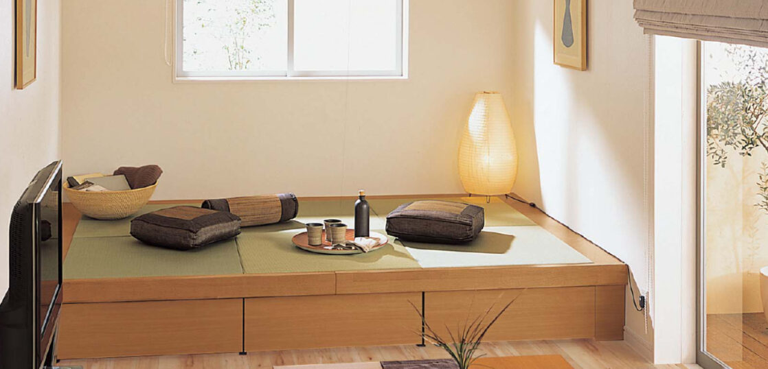 リビングの一角にソファーの代わりに和空間を作り出す畳が丘は、広さや形を自由に選ぶことができる畳コーナー収納です。ソファーやベンチのように座ったり、和室のように寝転んだりと、くつろぎ空間が生まれます。座面の下は引き出し収納とハッチ収納を組み合わせることができ、リビングで家族が使用するアイテムをたっぷり収納できます。