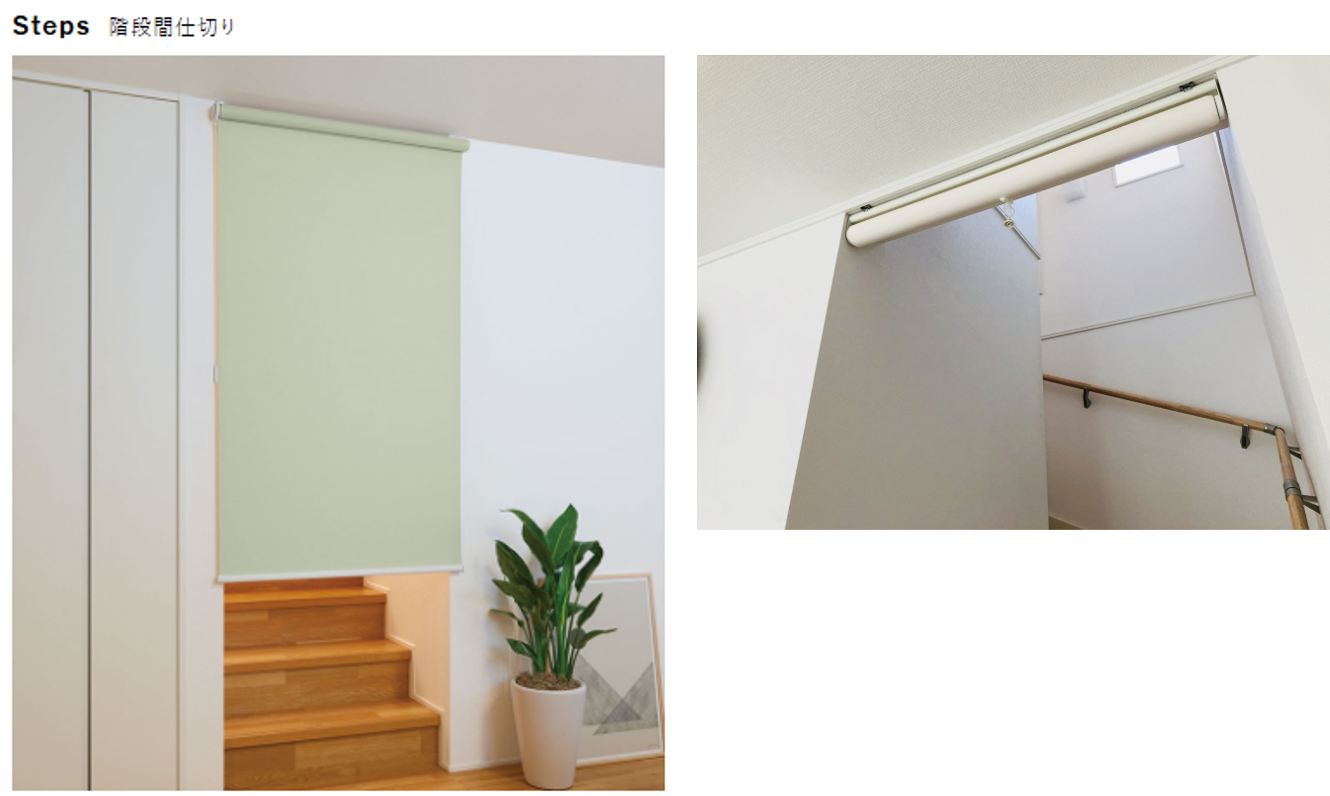 リビング階段のある住宅では特に暖房の快適な空気が階段の方に逃げてしまい、効きが悪くなってしまいます。こういったケースを防ぎたい場合、階段にロールスクリーンを取り付けることで暖気や冷気を2階に逃げるのを防ぐ効果も期待できます。