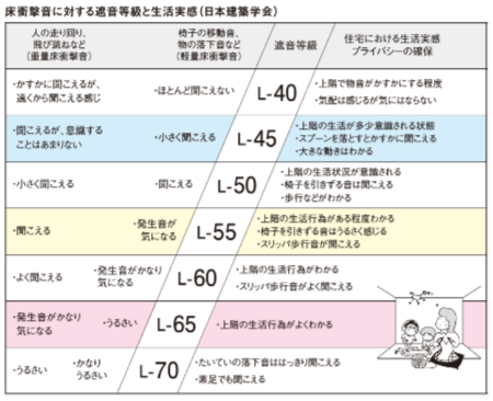 L値とは、上階の床で生じる音がどの程度小さくなるのかを基準として、遮音等級が設けられた数値で、音の伝わりにくさを表しています。 数値が小さいほど遮音性能がよいことを示します。