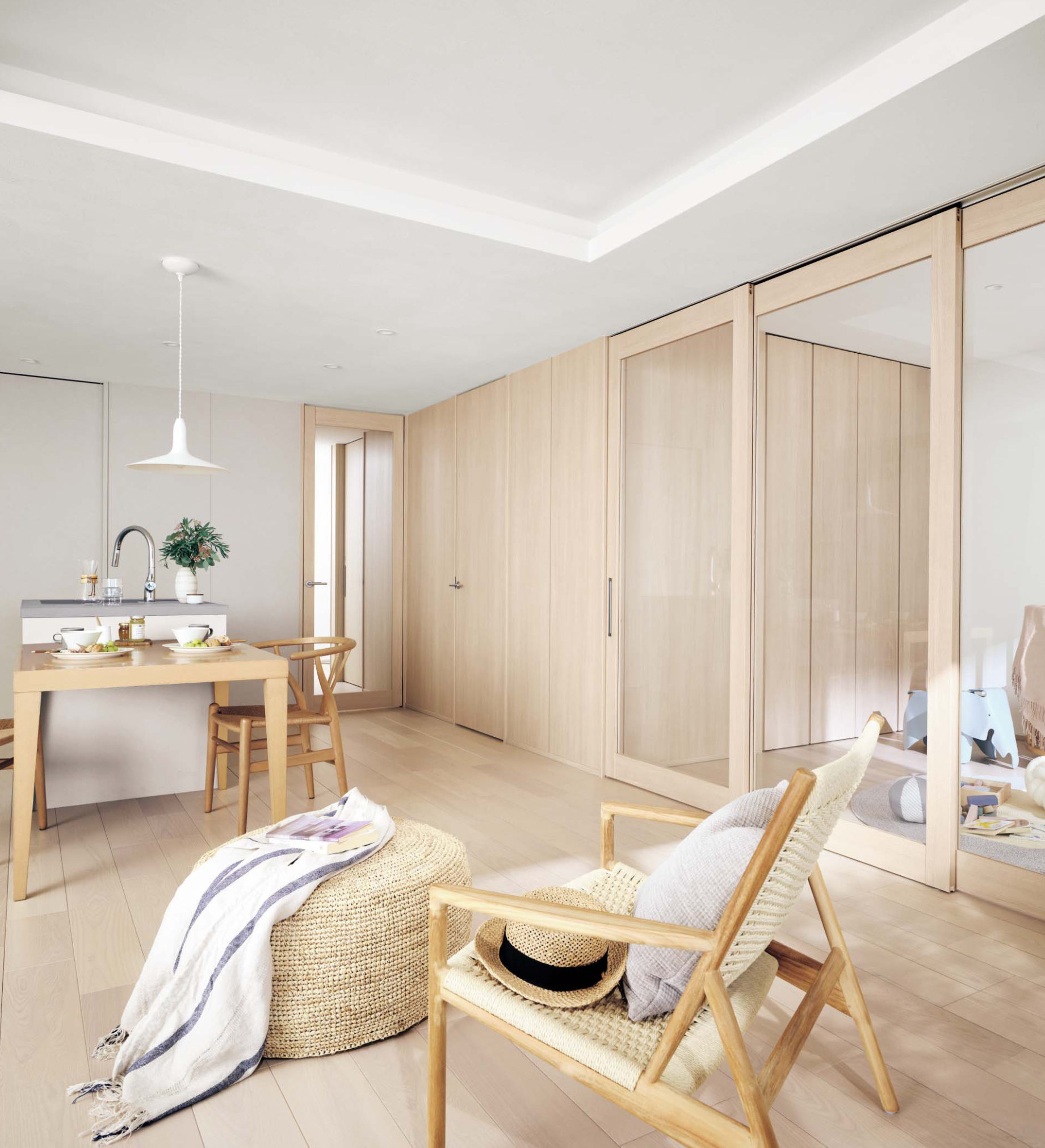 空間を広く見せるうえで、色や素材選びはとても重要です。壁や天井は白やベージュなどの明るい色を選ぶことで、光を反射し、部屋全体が広く感じられます。床材は部屋ごとに変えず、LDKを同じ素材で統一すると、空間がつながって見え、奥行きが生まれます。また、天井を一段明るくすることで、自然と視線が上に向き、天井が高く感じられる効果もあります。