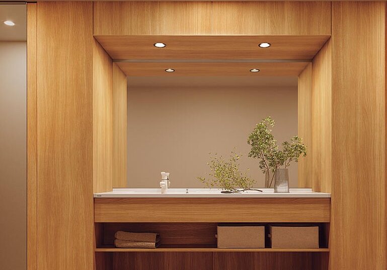 二つ目はリビング付近への設置です。こちらは「帰宅後すぐに手洗い・うがいをしたい」という衛生意識の高まりから注目されています。玄関からリビングに入る動線上、あるいはリビングの一角に洗面台を設けることで、家族や来客が自然に手を洗う習慣をつくることができます。特に小さなお子さんがいる家庭では「洗面所までいかずに済む」ことで手洗いのハードルが下がる点も魅力です。また、来客時に脱衣所を見せずに済むため、プライバシー面でもメリットがあります。デザイン性の高い洗面台を選べば、インテリアの一部として空間のアクセントにもなります。ただし、生活感が出やすい場所でもあるため、見た目の工夫や収納計画、使用後の水滴対策などが重要です。